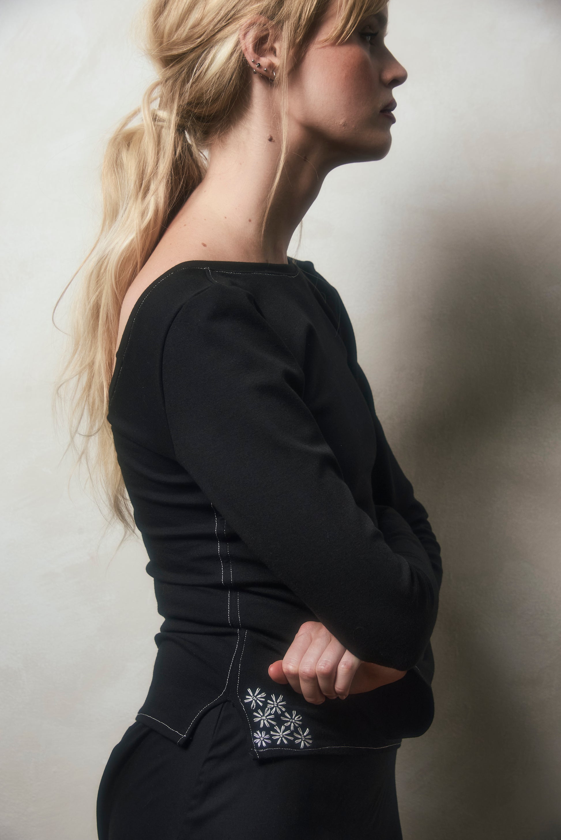 Whether you’re exploring the elegant streets of SoHo or attending a design event in Brooklyn, this shirt offers a polished, artistic statement. The flare sleeves catch light and movement; the low back allows for bold styling; and the embroidery turns a staple into a signature piece. Wear it with tailored trousers, a high-waisted skirt or slim denim for a look that balances strength with refinement.