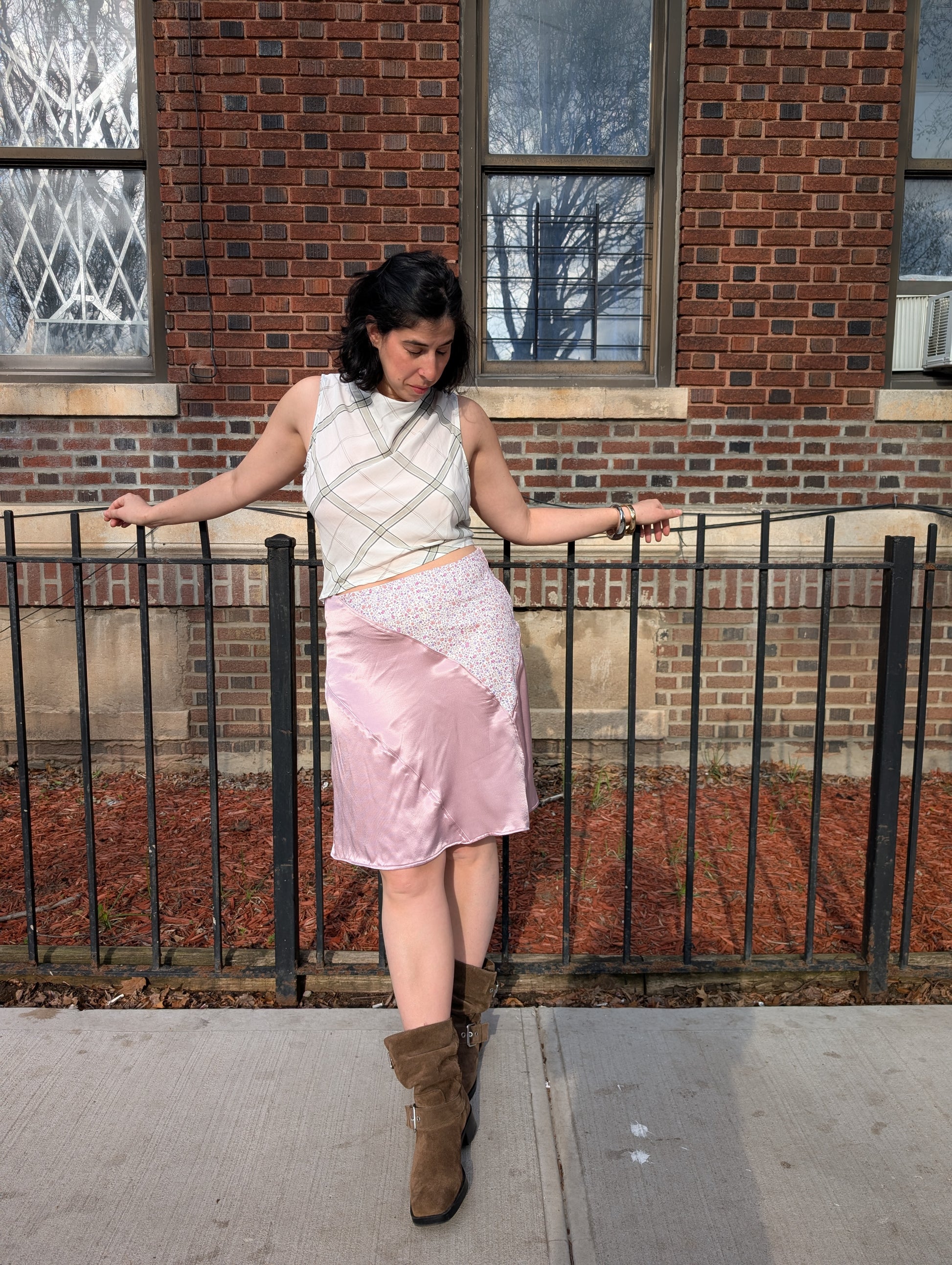 This midi skirt is a true work of art, combining contrasting textures and patterns for a visually stunning piece. The asymmetrical design features panels of lustrous pink Ecovero viscose satin, known for its eco-friendly and silky-smooth feel. A beautifully detailed floral combo fabric panel accents the waist, adding a touch of botanical elegance. The flowy midi skirt creates graceful movement with every step, while the side zipper ensures a sleek and comfortable fit.