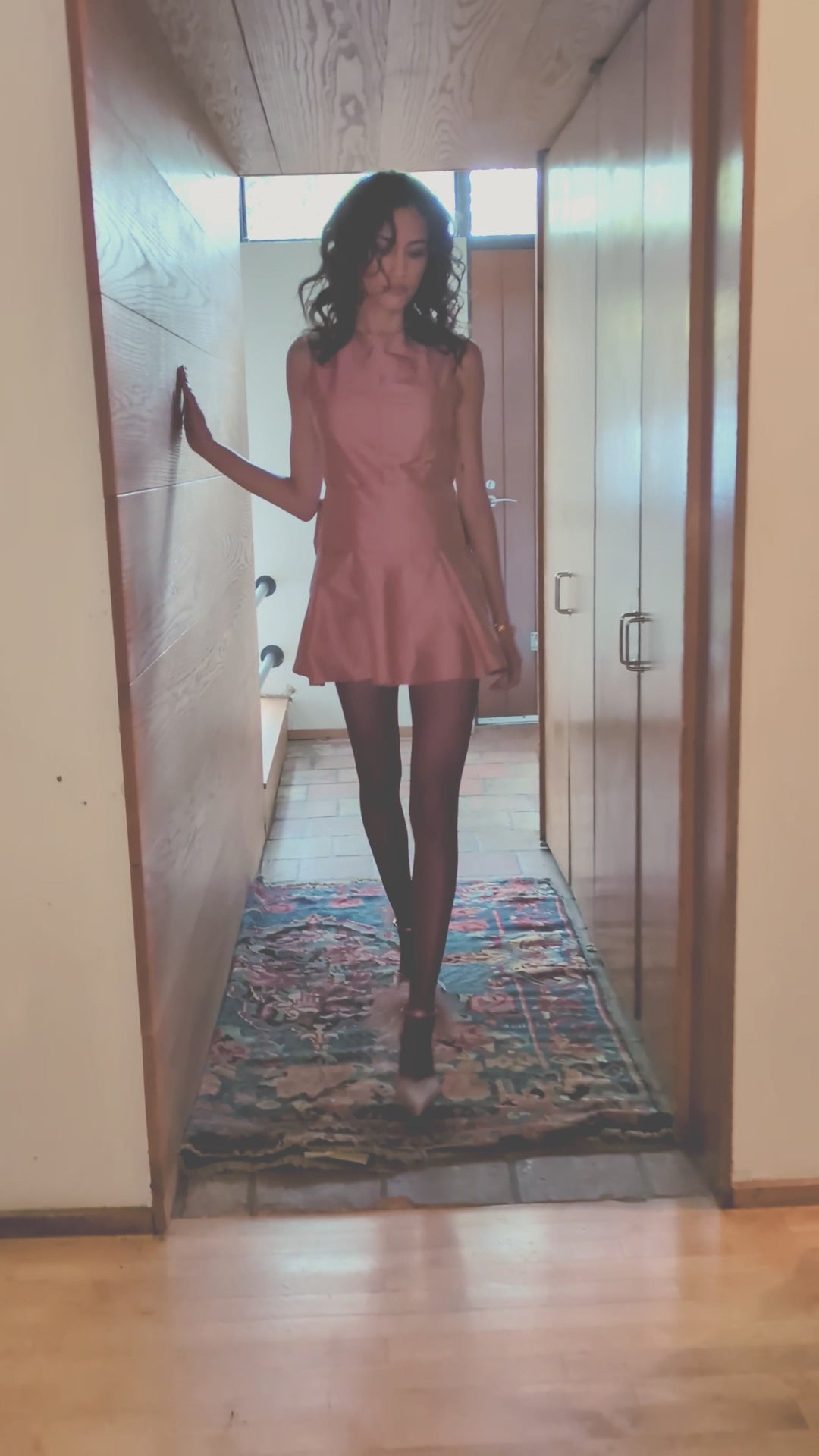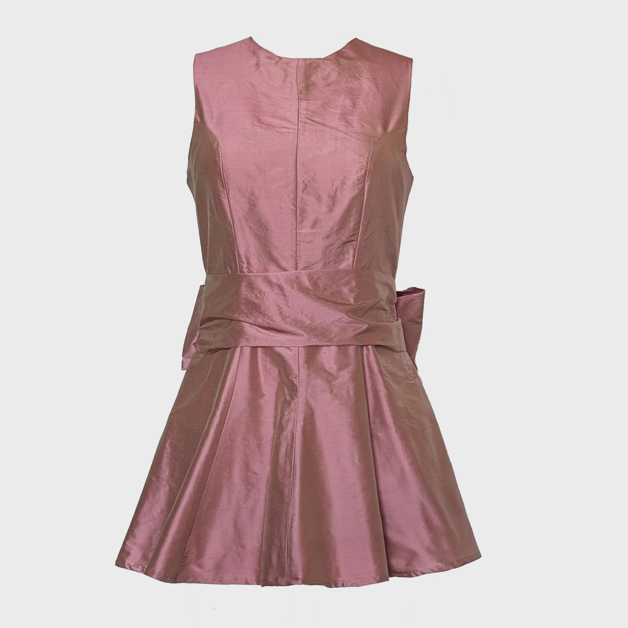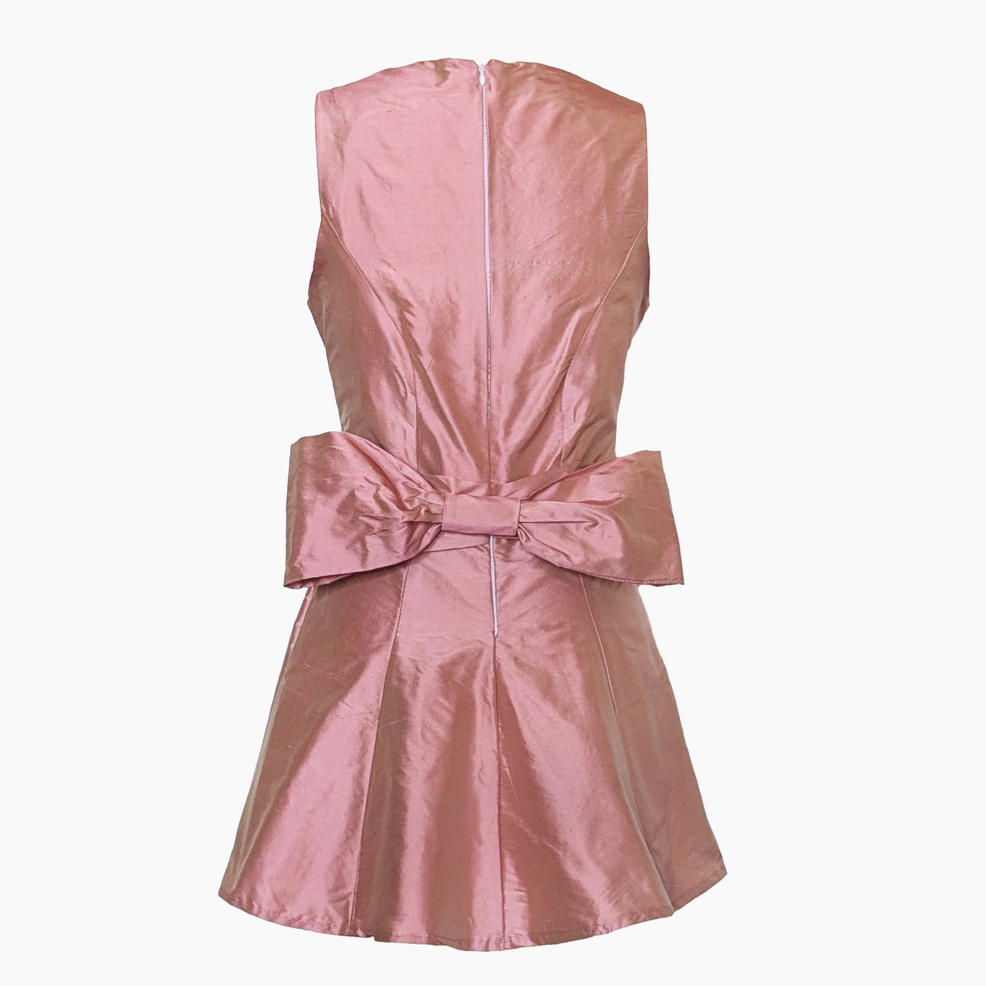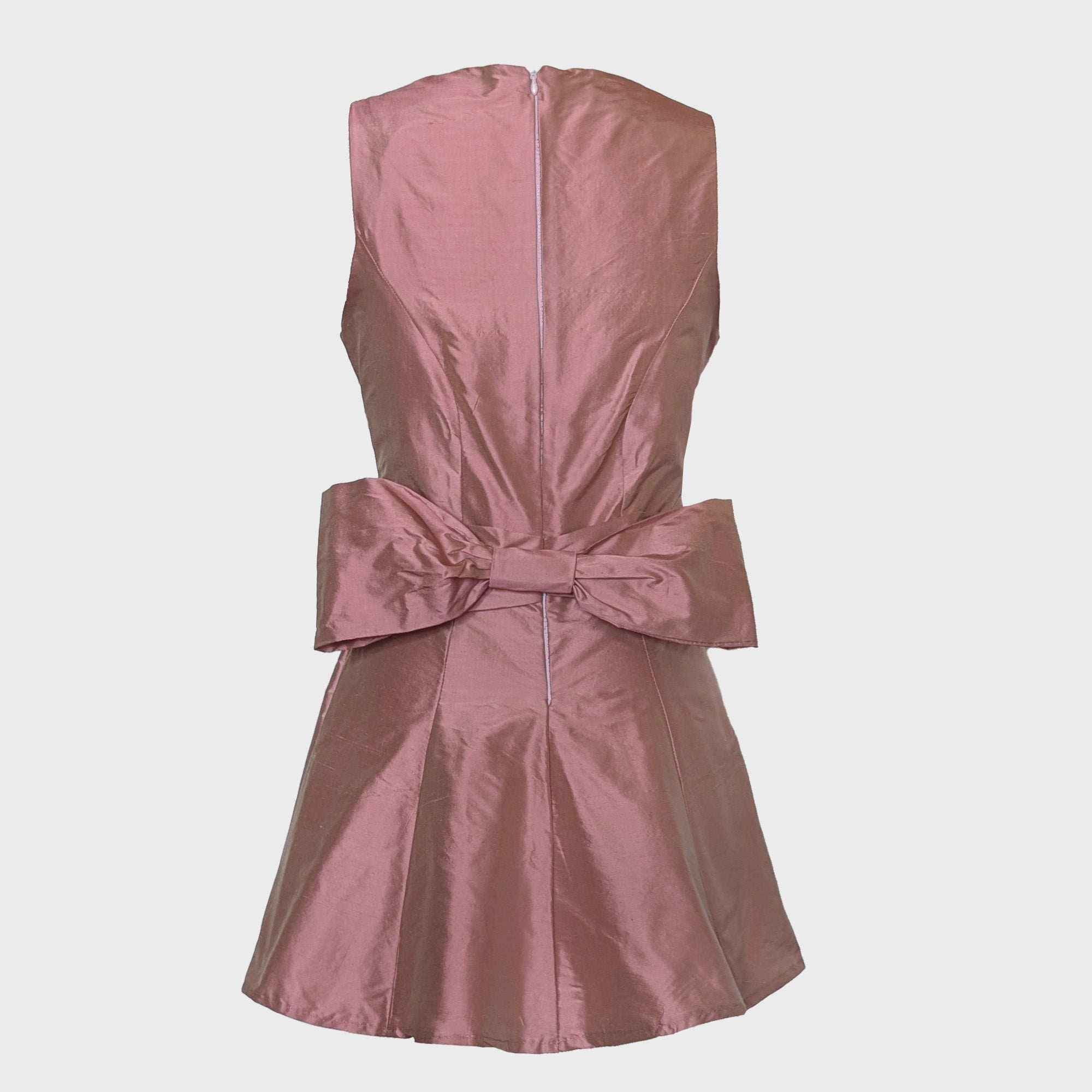 Radiant and graceful, the Ember Silk Mini Dress is made to capture light — and attention — from every angle. Crafted from 100% silk in an iridescent pink-gold hue, this dress shimmers delicately, revealing soft tones that shift between rose and champagne as you move.