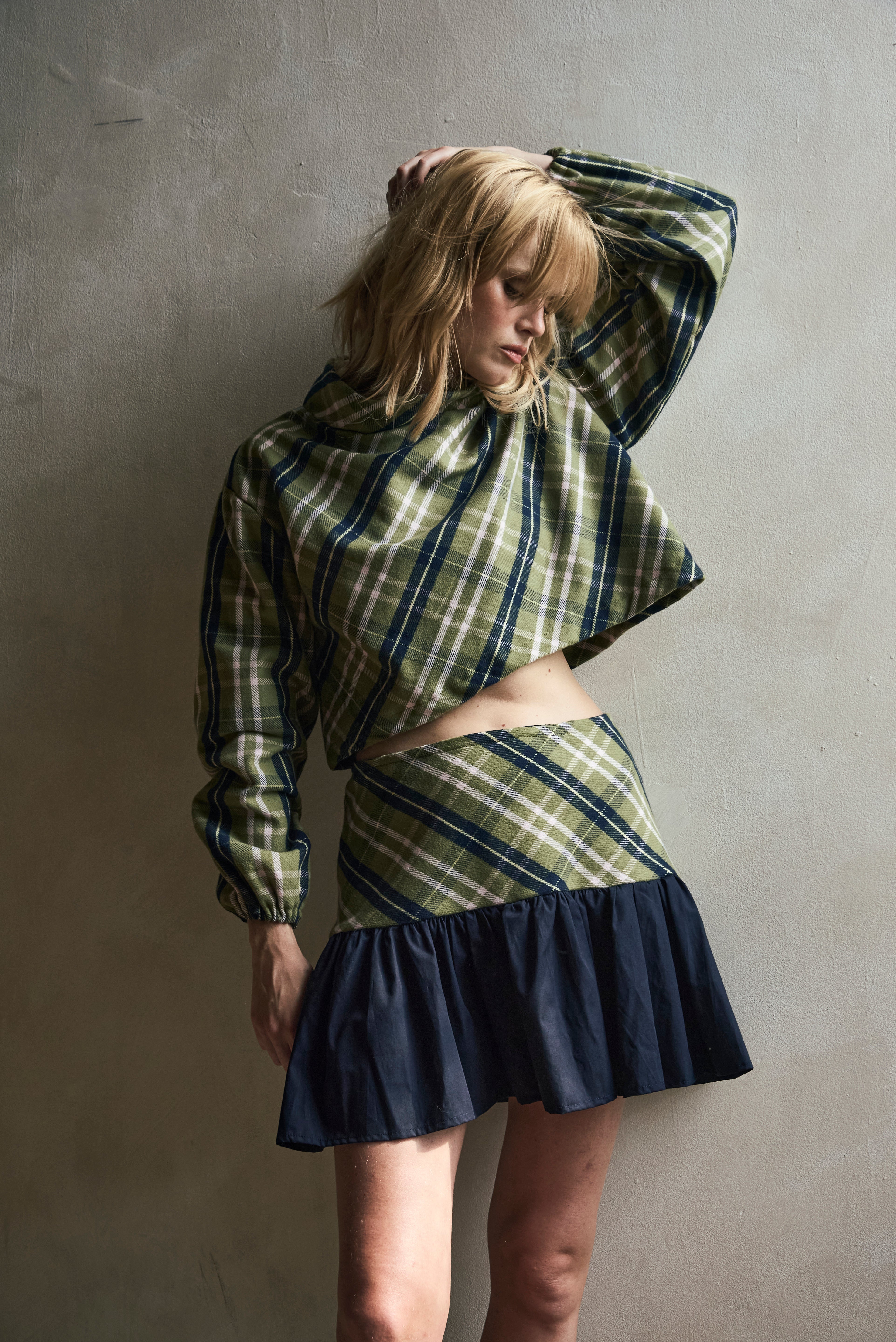 A fresh take on a classic, this green plaid flannel mini skirt combines timeless style with modern detail. Crafted from 100% cotton, it features soft green flannel with gathered pleats and a bold navy poplin hem for contrast. The playful mini length makes it perfect for NYC streetwear, fall festivals, or casual weekends in the city.