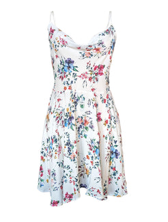 This Sofia White Floral Mini Dress is a modern vision of femininity. Made from high-quality Rayon fabric adorned with a delicate floral print, this mini dress is the perfect addition to your wardrobe. The cowl neckline adds a touch of elegance, while the adjustable strap and elastic in the back ensure a comfortable and flattering fit.