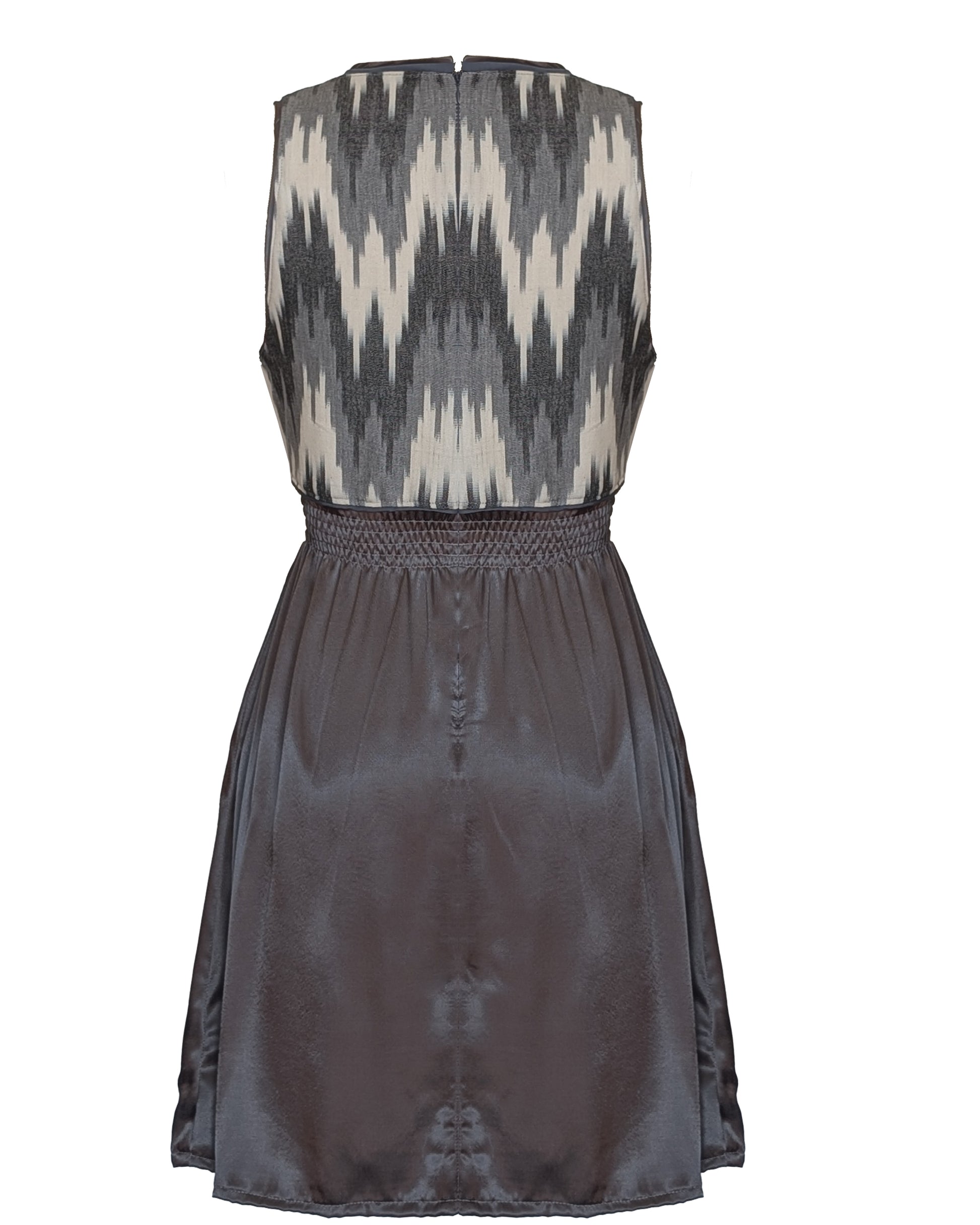 Discover effortless sophistication with this Grey Mini Dress, where structure meets softness in a timeless silhouette. The top bodice, crafted from breathable cotton with a geometric print, contrasts beautifully with the flowing grey EcoVero satin skirt. Designed with an elastic waist for comfort and a zipper at the back for a perfect fit, it features a deep V-neckline that flatters the figure and a lightly flared A-line shape that moves gracefully with every step.