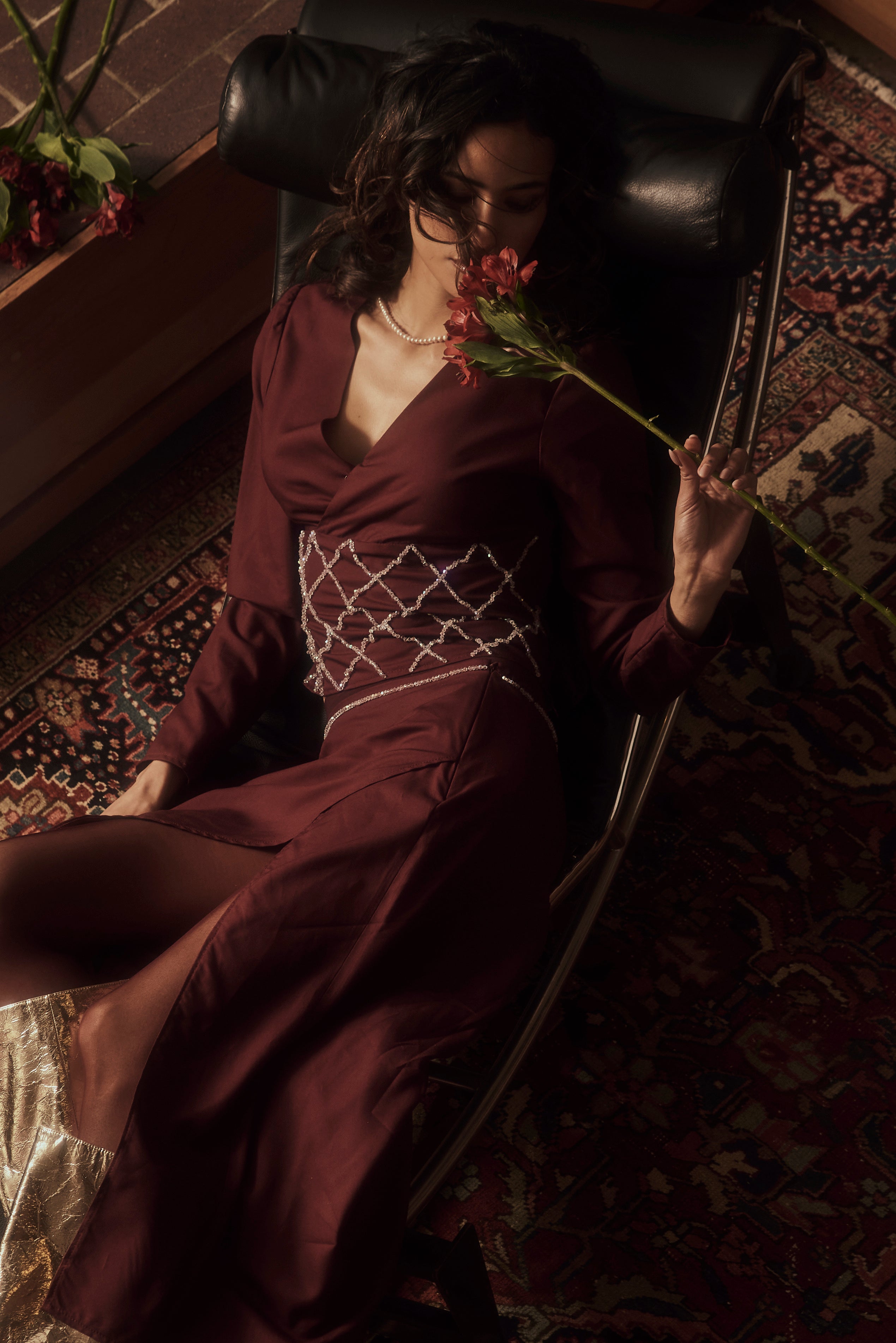An invisible side zipper ensures a smooth fit, while a dramatic oversized bow at the back adds a touch of sculptural romance — the perfect festive statement. Under the bust, delicate white bead handmade embroidery forms subtle diamond motifs, catching the light with every movement and evoking the sparkle of holiday nights.