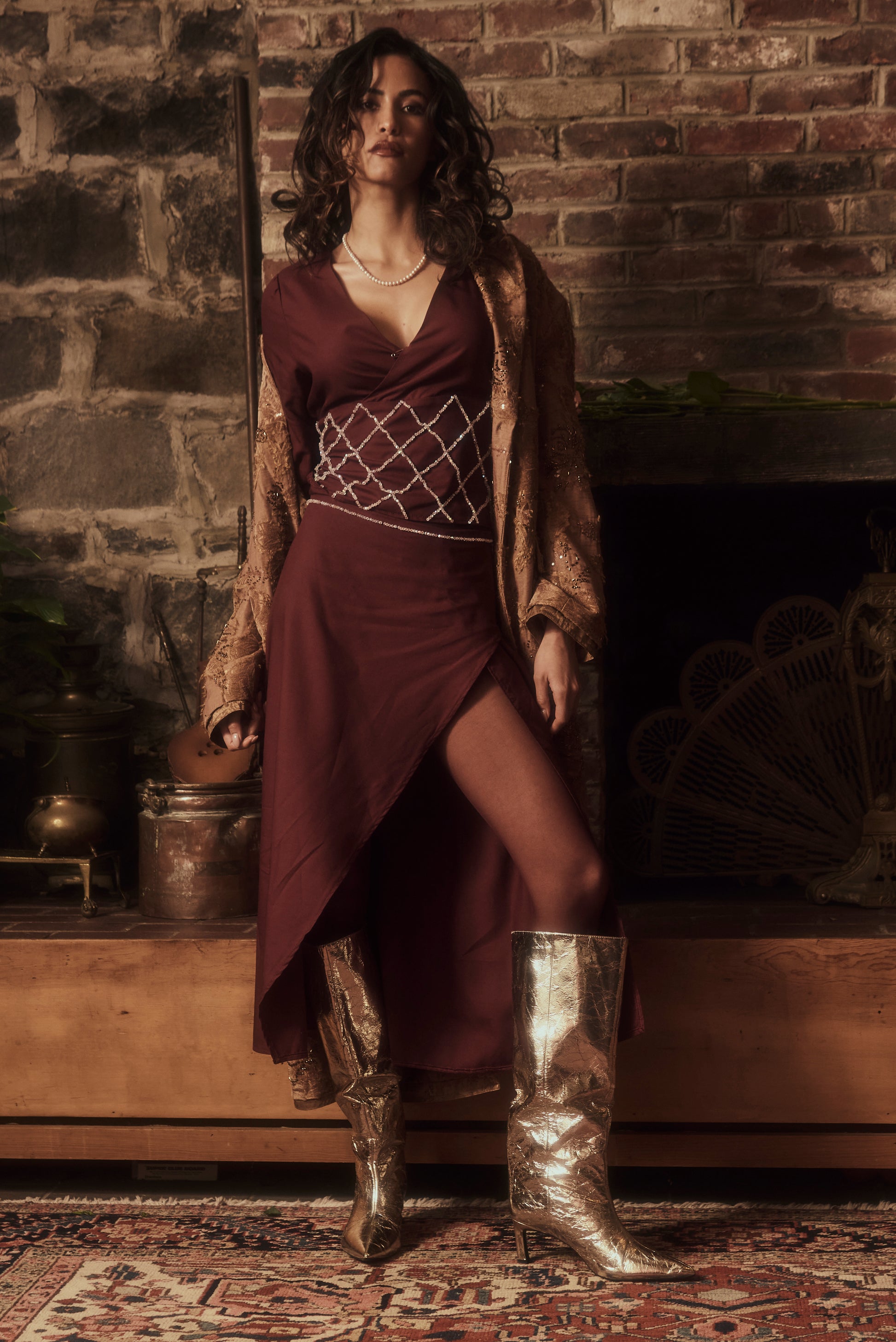 For the full Holiday look, match with the Wine Burgundy Slit Skirt