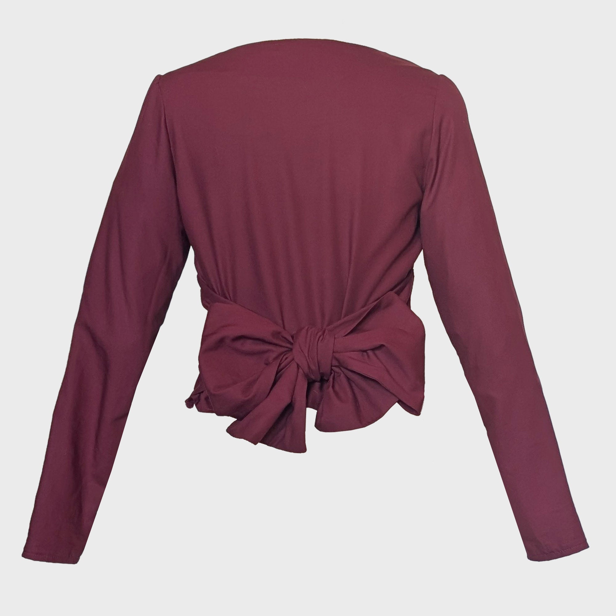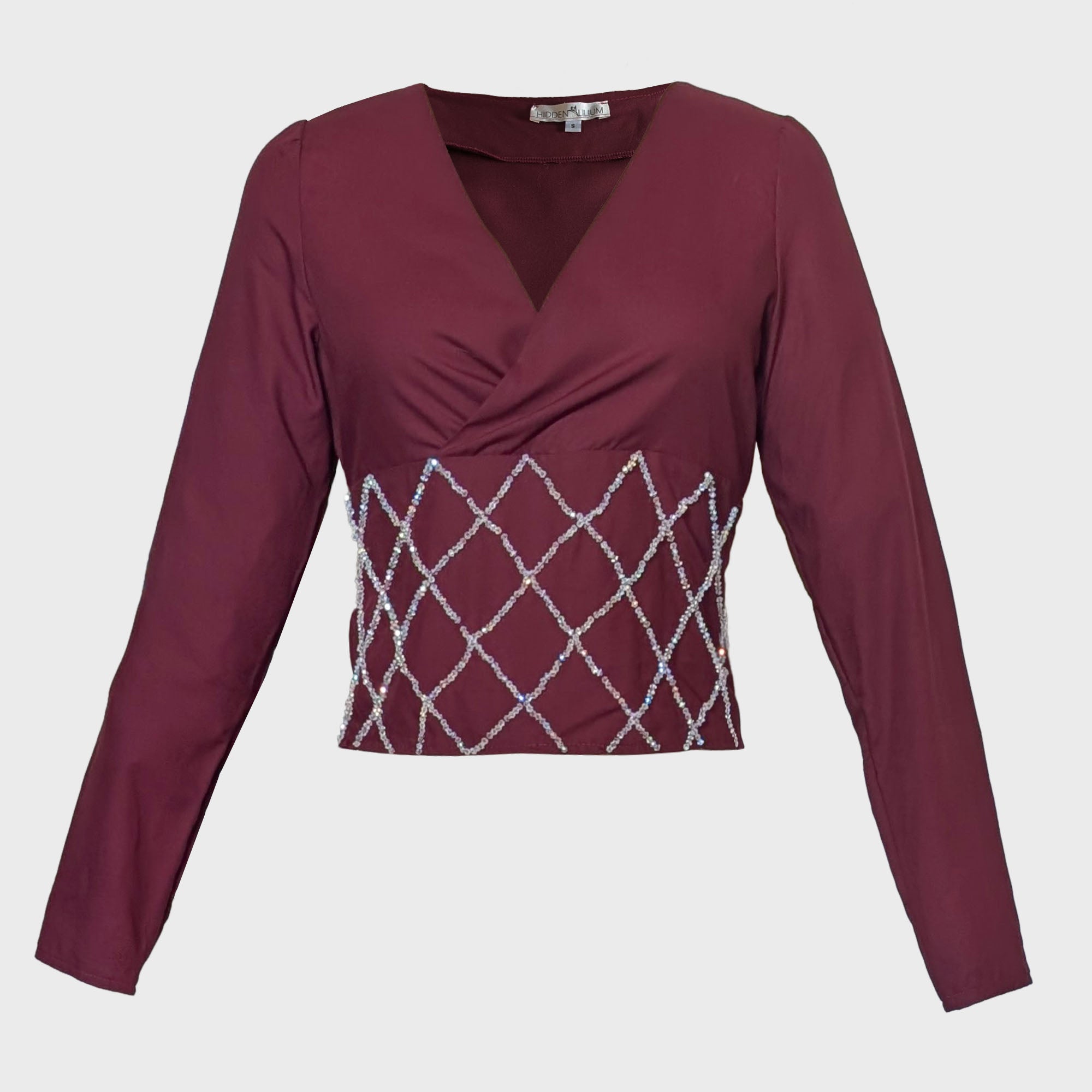Celebrate the season in effortless sophistication with the Sparkle Bow Top, crafted from 100% Chillas rayon in a rich wine burgundy hue. This elegant long-sleeve blouse features a deep V-neckline with a soft overlap at the center, creating a flattering, feminine silhouette.
